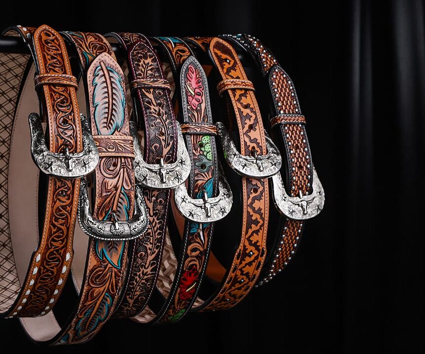 For handtooled belts and artisan items, we also use semi-aniline and drum-dyed full-grain leather that responds well to embossing, paint, and carving.